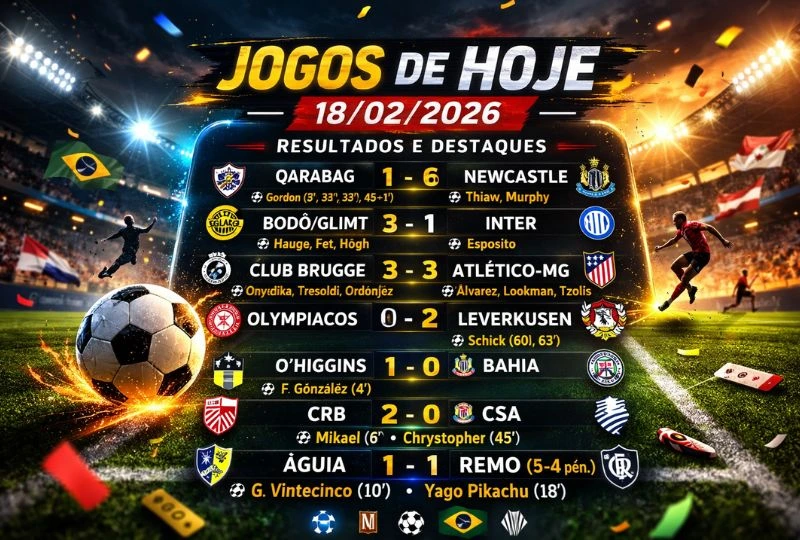 A jornada de 18 de fevereiro de 2026 trouxe goleadas históricas, empates emocionantes e surpresas tanto na Europa quanto no Brasil. O Newcastle praticamente garantiu sua vaga com um festival de gols de Anthony Gordon, enquanto o Bodø/Glimt provou sua força ao bater a Inter. Já na América do Sul, Bahia e Botafogo enfrentaram dificuldades na Libertadores, e os estaduais mostraram equilíbrio com vitórias no último minuto e decisões nos pênaltis.